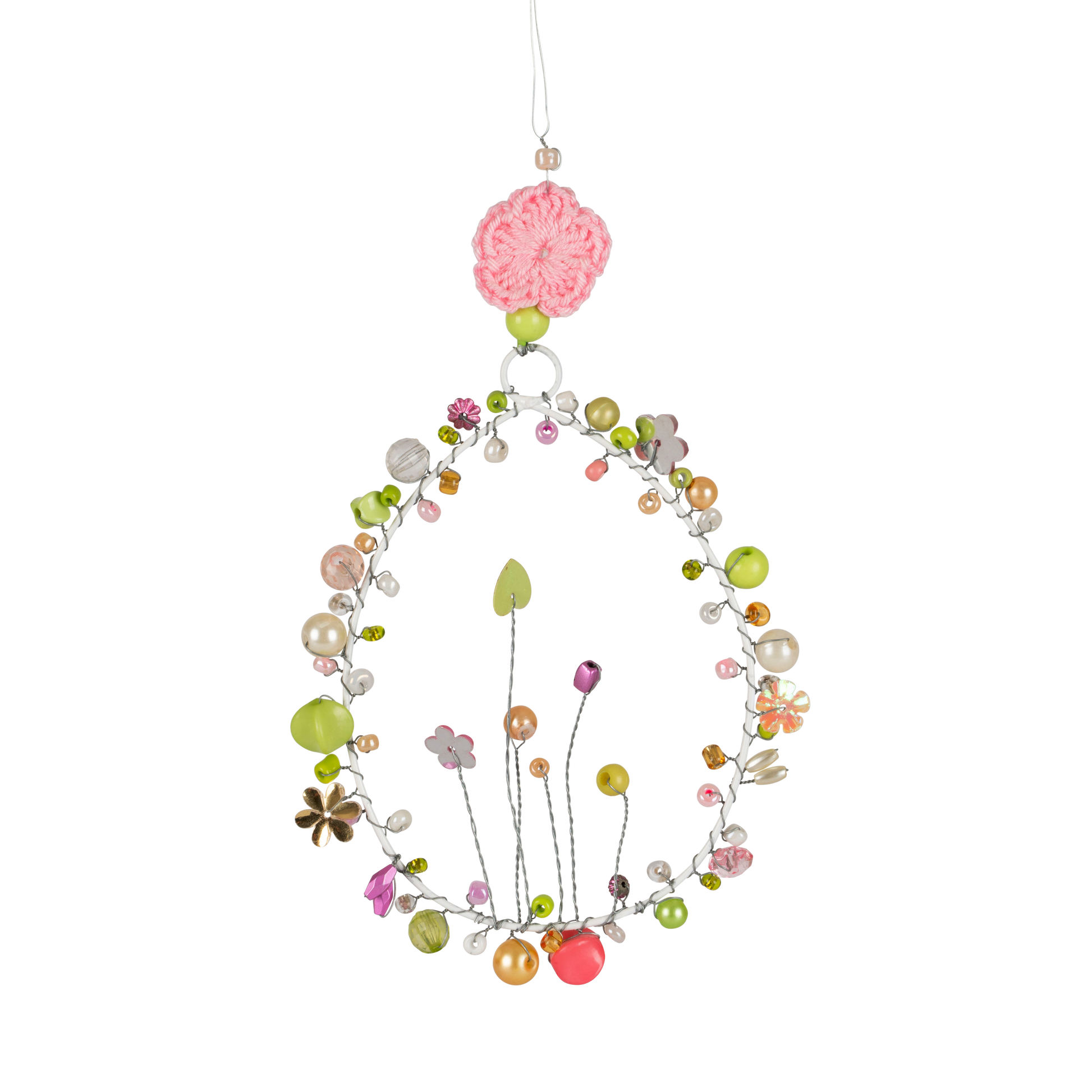 Et sødt påskeæg pyntet med små fine perler i flotte forårsfarver. Det har et let og enkelt udtryk, der passer perfekt ind i den hyggelige påskepynt.